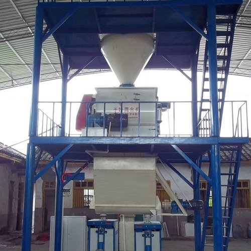 干粉砂浆设备主要由储料罐,双轴无重力混合机,提升机,待混仓,小料仓,成品仓,包装秤,斗提机,除尘器,全自动计量配料秤仓,框架等组成。储量罐主要用来储存原料,一般容量为60立方,数量为3个,用来储存水泥,粉煤灰,沙子等物料,生产时根据客户的配方将水泥,粉煤灰,沙子按比例输送到配料秤仓内,在由配料秤仓将配好的物料送到斗提机内,纤维素、胶粉等小比例贵重母料可通过电子秤计量投入外加剂料斗,经斗提机将物料提升到框架上面的待混仓内等待混合,然后将物料卸入双轴无重力混合机内进行混合,混合后的物料由气动门进入成品仓内,再由阀口包装机进行包装即可完成操作,与简易型生产线相比又先进了一步。